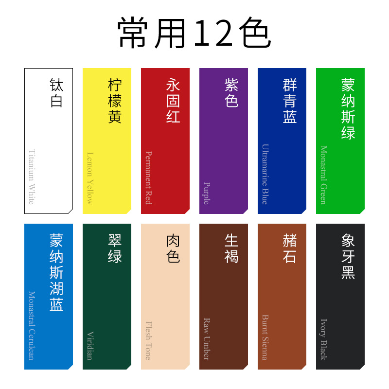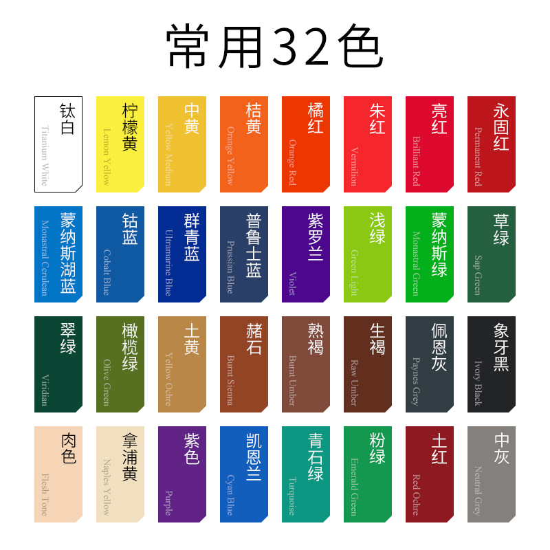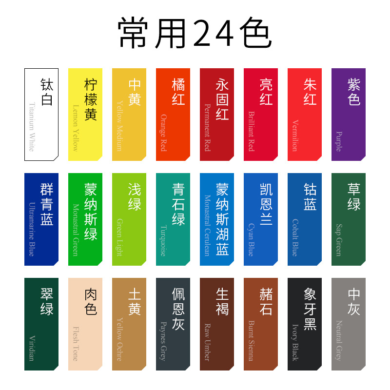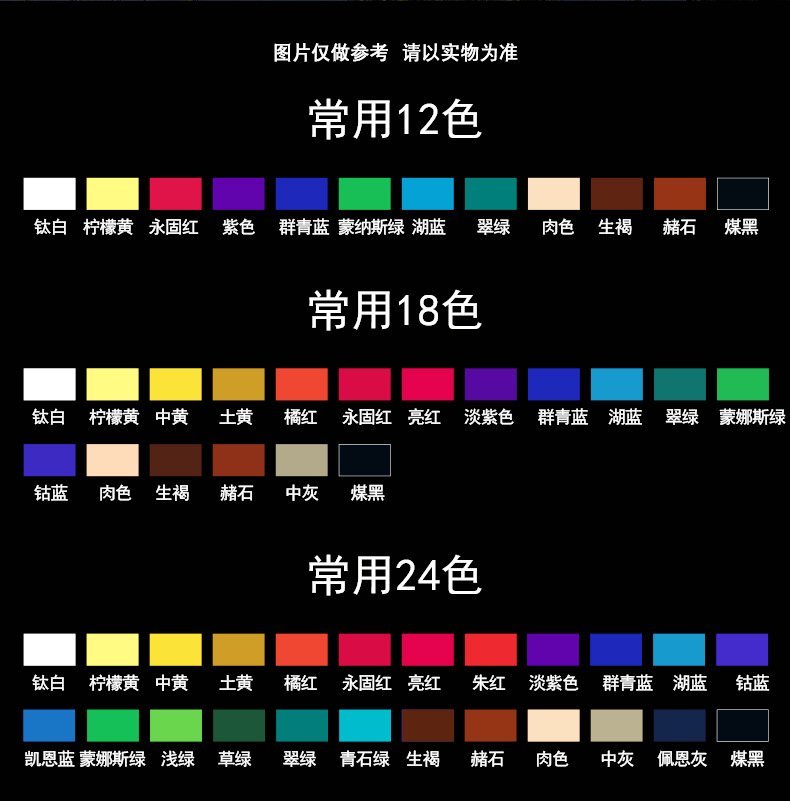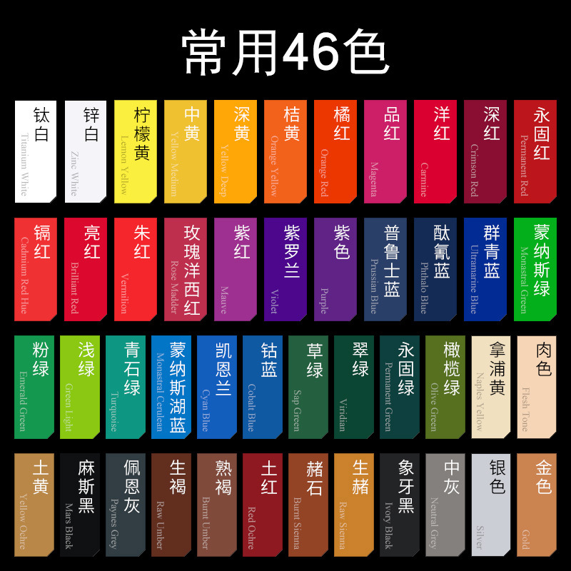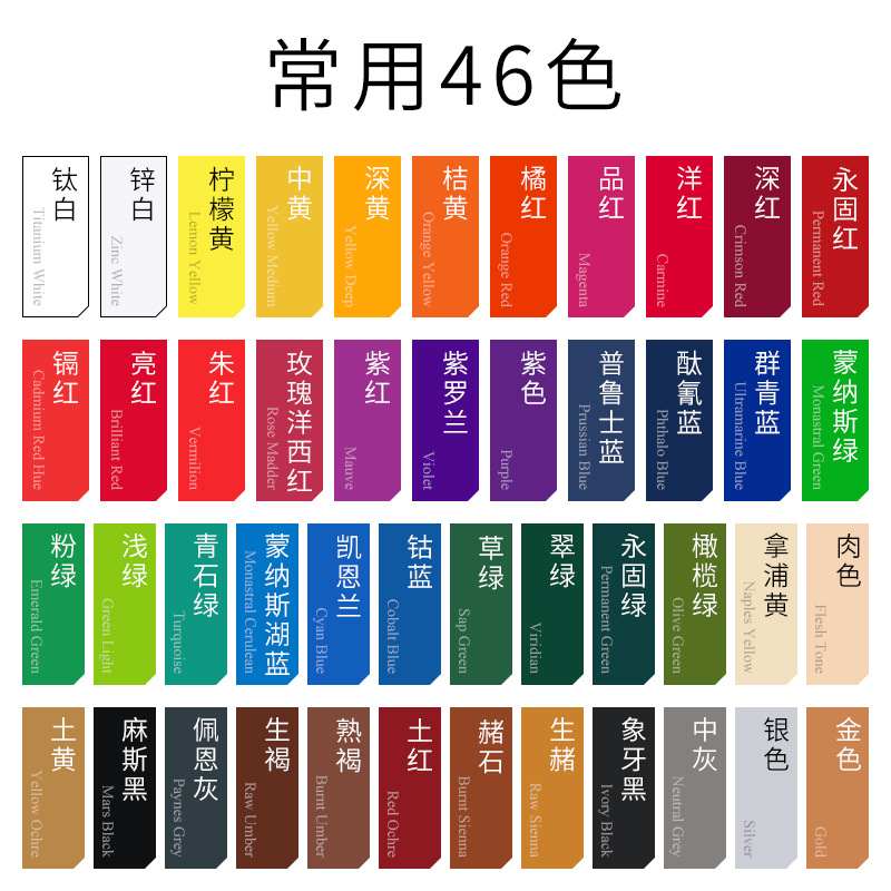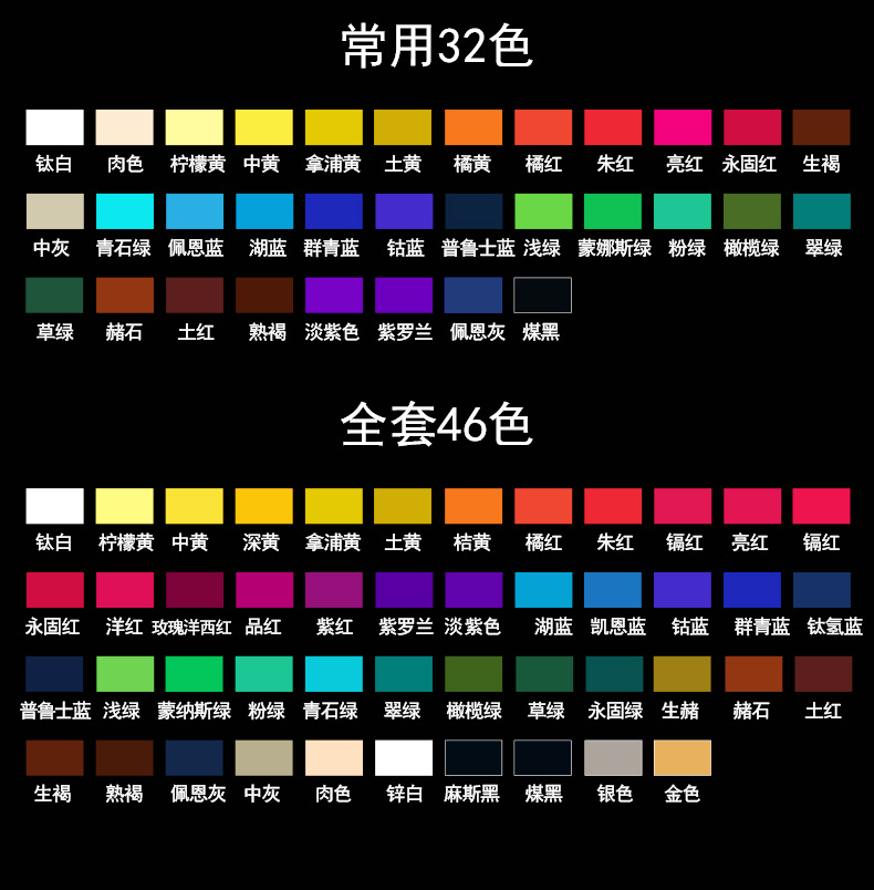 常规12色,常规24色,常规32色,全套46色,钛白,锌白,柠檬黄,中黄,深黄,品红,洋红,深红,永固红,镉红,亮红,朱红,玫瑰洋西红,紫红,紫罗兰,普鲁士蓝,酞青蓝,群青,钴蓝,凯恩兰,蒙纳斯湖蓝,蒙纳斯绿,浅绿,粉绿,青石绿,草绿,翠绿,永固绿,橄榄绿,土黄,土红,生赭,赭石,熟褐,生褐,佩恩灰,麻斯黑,象牙黑,中灰,银色,金色,紫色.,肉色,拿浦黄,橘黄,橘红