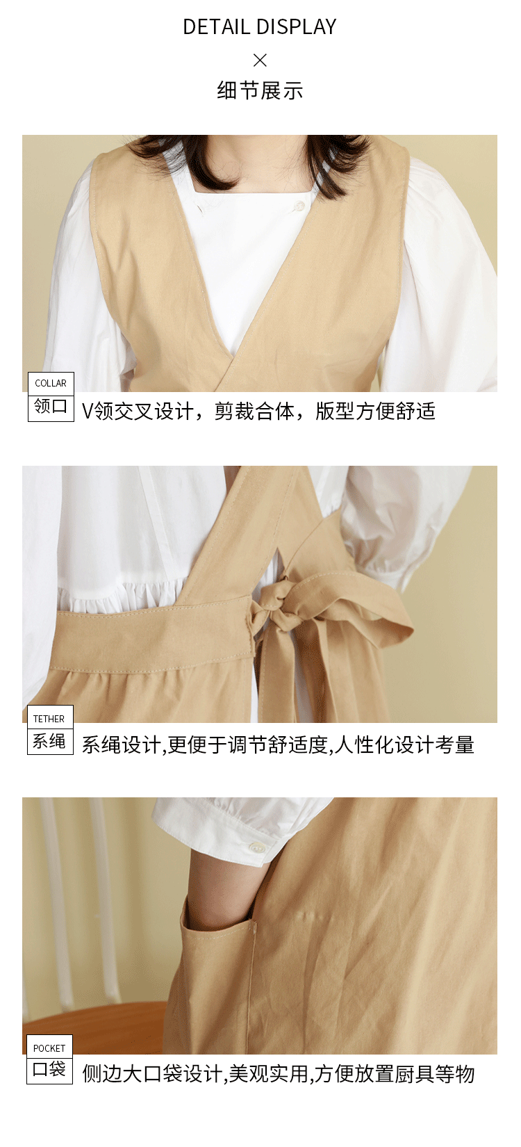 日系纯棉无袖大V领品质围裙 清新系带家务防污防水围裙
