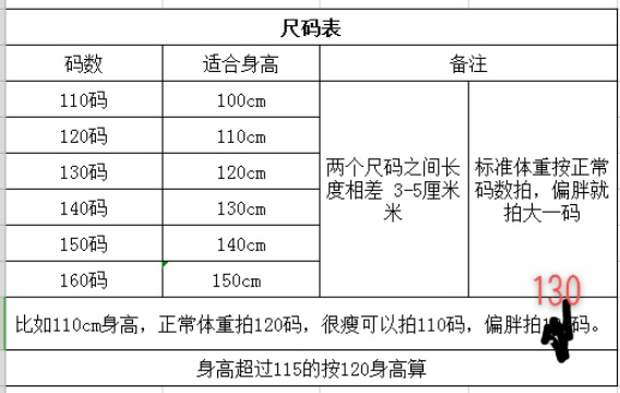 100码适合身高90cm,110码适合身高100cm,120码适合身高110cm,130码适合身高120cm,140码适合身高130cm,150码适合身高140cm,160码适合身高150cm,170码适合身高160cm,180码适合身高165-175cm,190码适合身高170-175cm