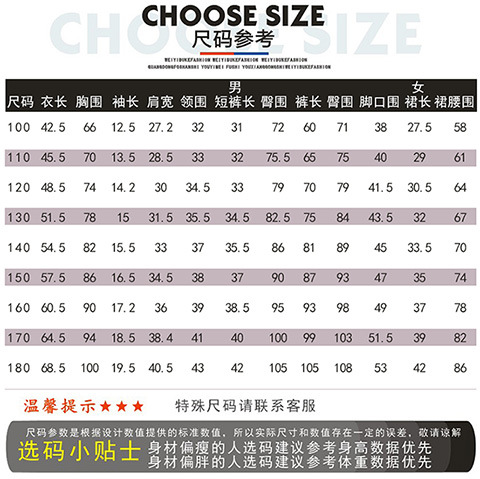 100码适合身高90cm,110码适合身高100cm,120码适合身高130cm,130码适合身高120cm,140码适合身高130cm,150码适合身高140cm,160码适合身高150cm,170码适合身高155-180cm,180码适合身高160-165cm