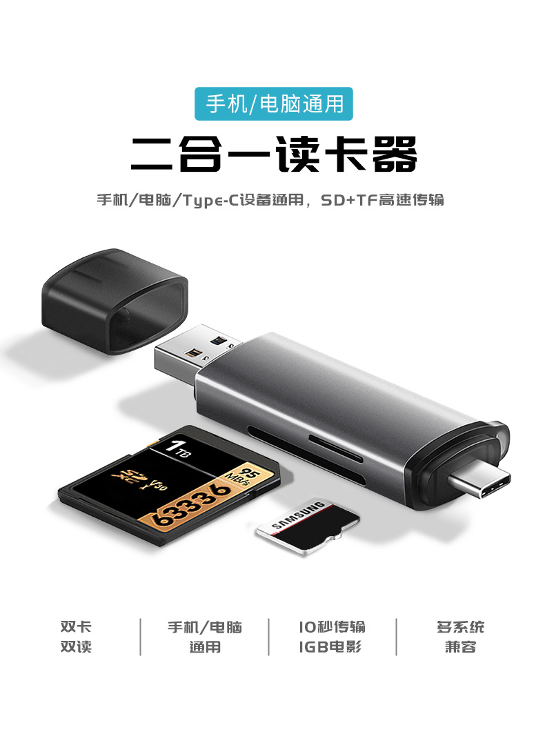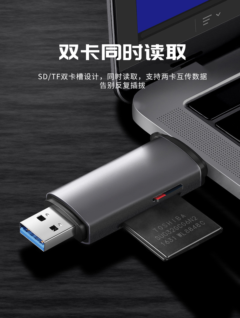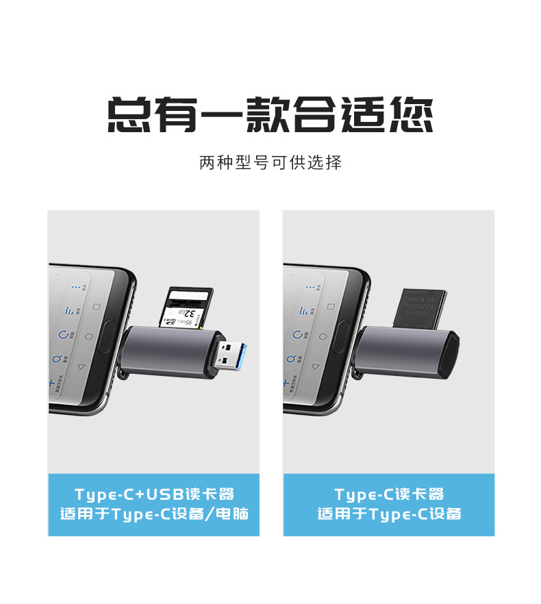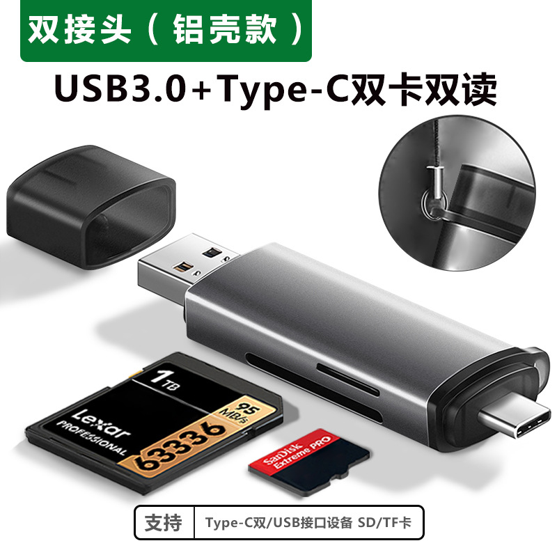 【双卡双读】铝壳款USB3.0+Type-C,高品质3.0读卡器,原厂直销,铝合金材质